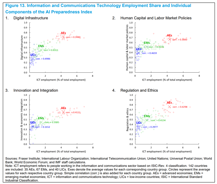In “Gen-AI: Artificial Intelligence and the Future of Work”, the IMF proposes a conceptual framework that assesses countries and occupations based on the level of exposure and complementarity. Given the structure of labour markets, it naturally finds advanced economies to be more at risk while emerging markets are considered less vulnerable. However, that’s largely because work force is overwhelmingly in employed in primary industries. So even if those jobs are not particularly threatened in the near future, they still typically have lower per-capita output compared to the export-oriented services sectors.