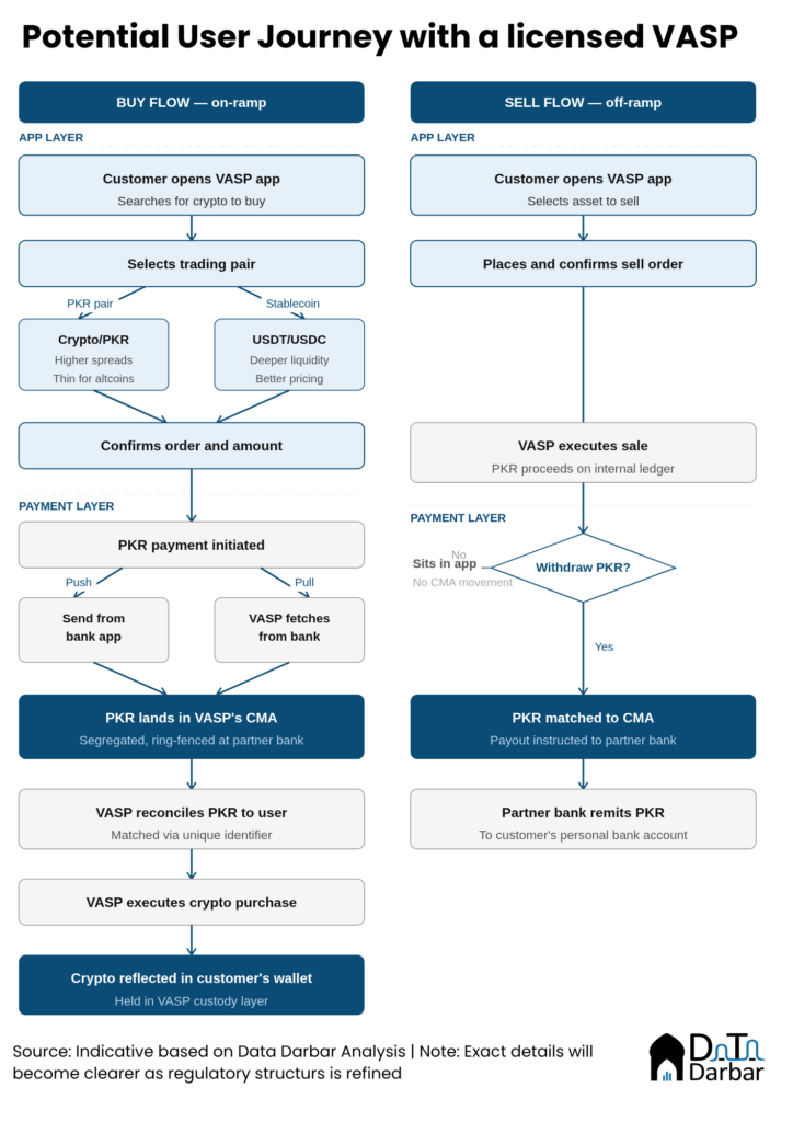 Second, funding can occur through either a push model or a pull model. In a push model, the customer initiates the transfer from a bank app. In a pull model, the instruction is initiated within the VASP interface and the funds are fetched from the linked bank account. In both cases, the operationally important moment is the same: PKR lands in the VASP’s CMA at the partner bank, is reconciled to the customer through a unique identifier, and only then is the crypto purchase executed.