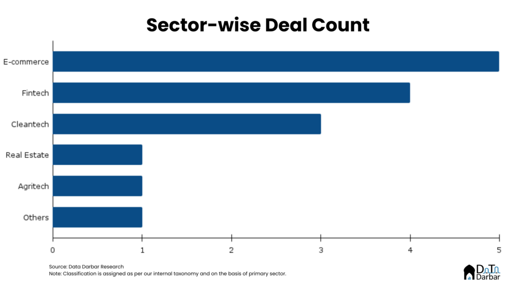 Fintech once again dominated, both in terms of volume and capital raised. The sector was anchored by Haball’s Pre-Series A funding round, backed by Zayn VC and Meezan Bank, alongside Metric’s $1.3M seed round led by an international syndicate. Consumer-facing fintech remained selective, with Qist Bazaar raising $ 196,000 in debt as part of its Series A round from Bank Alfalah. In contrast, additional angel and early-stage rounds contributed to the volume without materially moving the aggregate dollar figures.