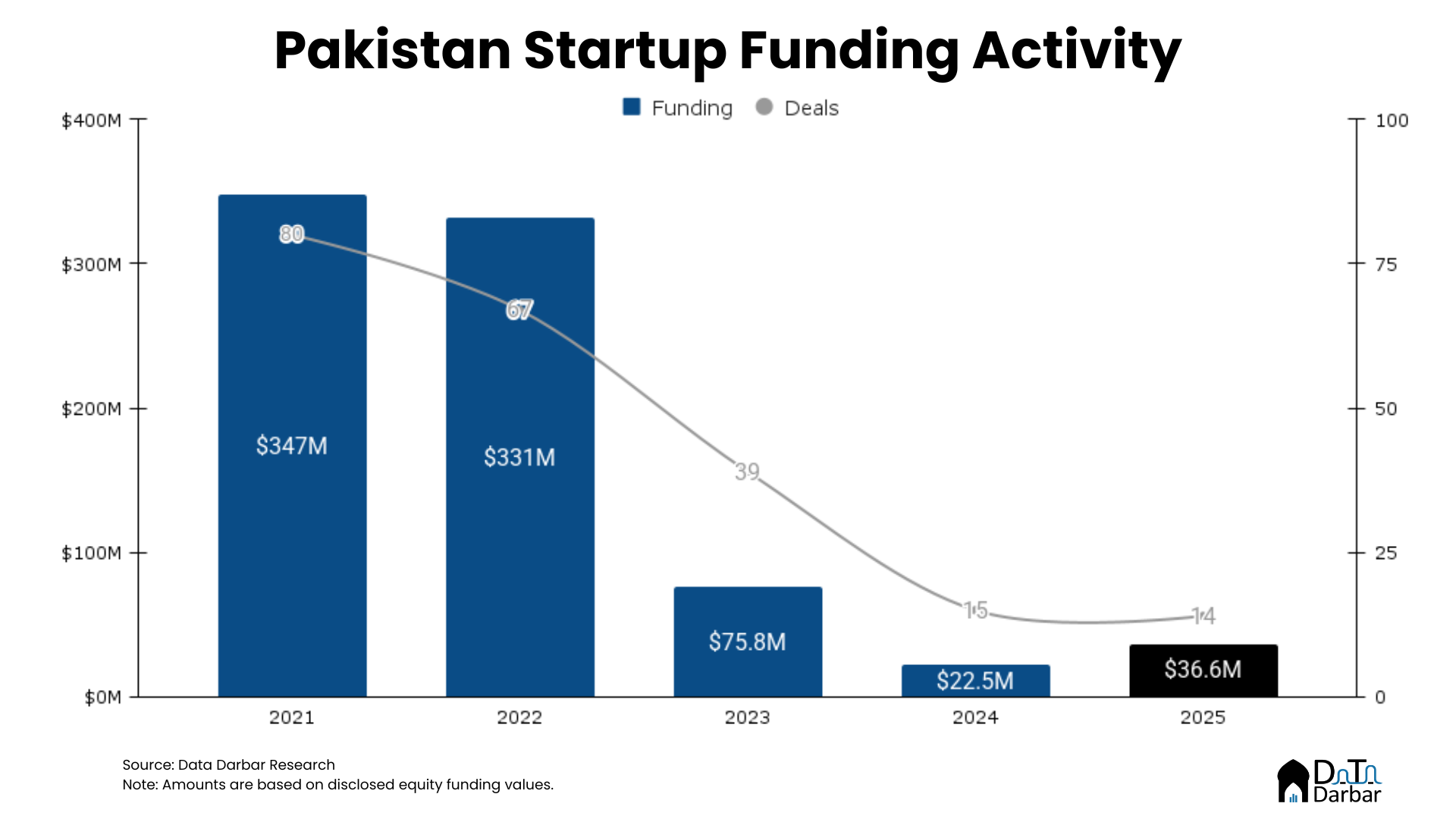 Pakistani startups in 2025 experienced a modest increase in funding activity, although the ecosystem remains significantly below its previous levels. Based on press or social media announcements, startups raised approximately $36.6 million in equity capital across 10 rounds, while four additional transactions did not disclose dollar values.