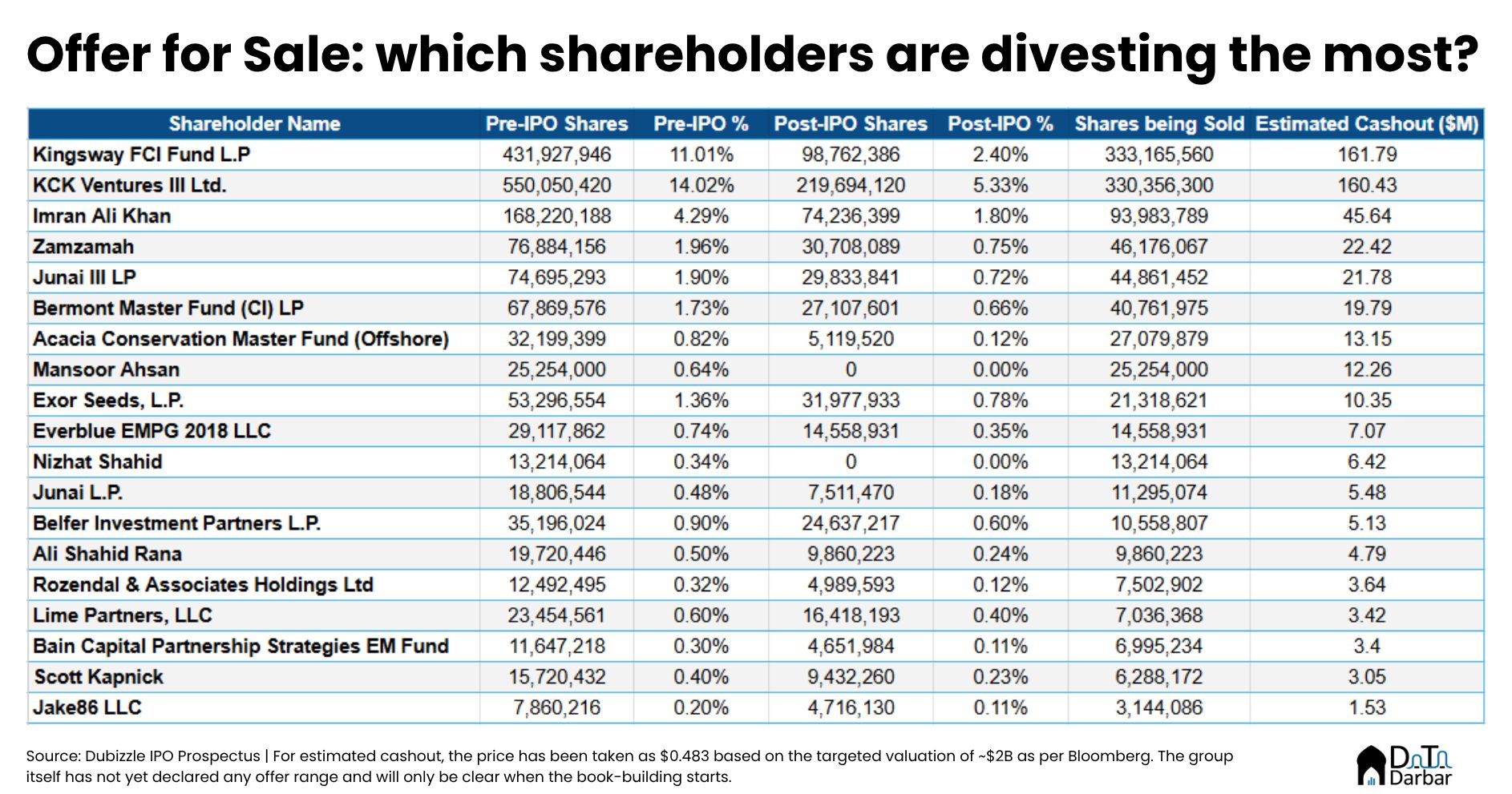 Perhaps the more interesting question is who all are divesting? Or in other words, which investors will make bank by selling their shares to the public? More importantly, how much are they set to gain as a result? In absolute terms, Kingsway and KCK Ventures are looking to part with over 330M shares each, and will reduce their stakes to single digits post-listing. Imran Ali Khan, the co-founder and CEO of Dubizzle, is also eyeing to sell almost 56% of his equity.